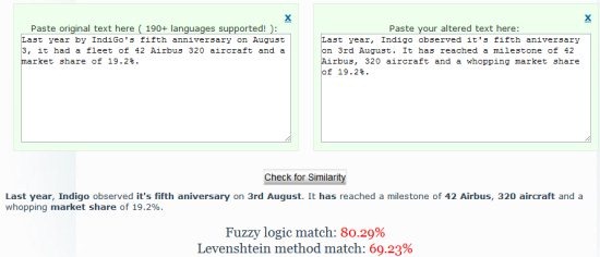 - The results of the plagiarism detection for our pasted text can be seen in the snapshot below: