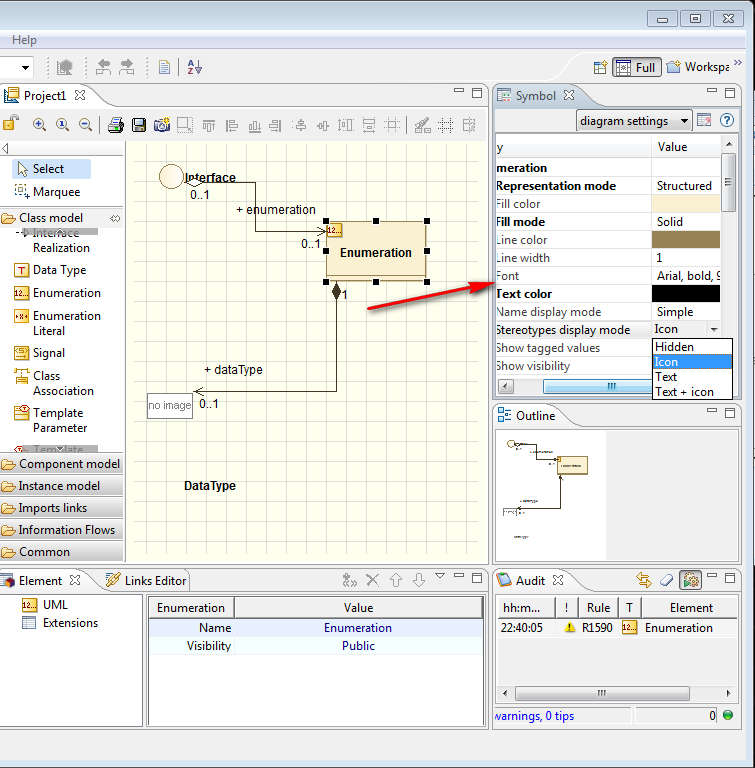 For creating the type of design that you can see in the image above all that you need to have open is the Class model list of elements and while you’re there start drawing the layout by creating an Interface. This would be the start point of the diagram that you are modeling with the help of Modelio. Go through all the elements to see what kind of elements are offered, so that you know them when you’re creating your own models.