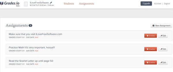 On the first image from the top, you can see how the student management portion of Grades.io looks like. Image above is the second most important aspect of class management, assignments. New assignments can be added by clicking on the New Assignment button in the top right corner. Each new assignment is added to the list down below from where you can grade every student for it by clicking on the Grades button.