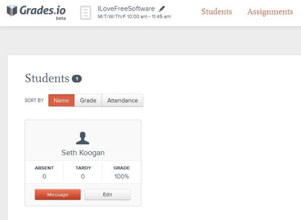 Grades.io is a free online class management software which teachers can use in order to manage a school class. Free accounts are limited to just one class where you can add unlimited number of students and assignments. Grades can either use percentages or the points system. For each student you can keep notes about attendance, grades, and you can send out messages to entire class at once.