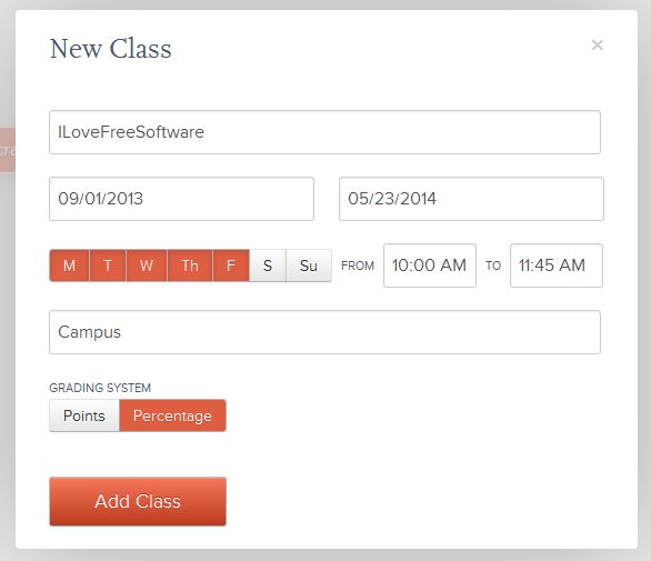 New class window will come up where you have to type in class name, duration of the lectures, days and hours when they will be taking place, location and the grading system. When you’re done click Add Class.