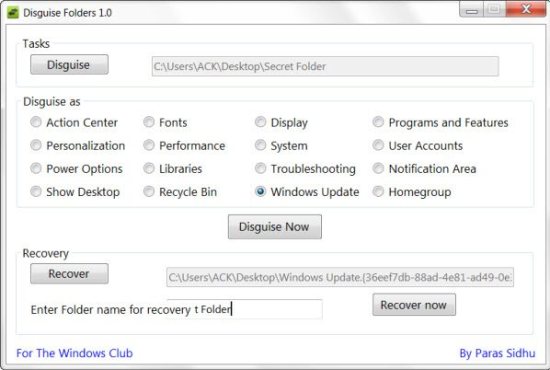 There are good number of choices like Action Center, Fonts, Display, System, Windows Updates, Homegroup, User Accounts, Personalization, Performance, Recycle Bin and many more. After selection click on the button Disguise Now! Instantly you will see that the folder you want to hide is replaced by a folder called Windows Update or Control Panel or whatever disguise you have chosen for it. Even clicking it will open up your Windows Update folder! To recover just select the recover button and find the disguised folder and then enter the folder name. Clicking recover now will place your old folder where it was before.