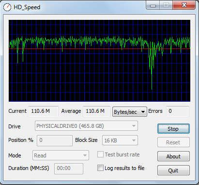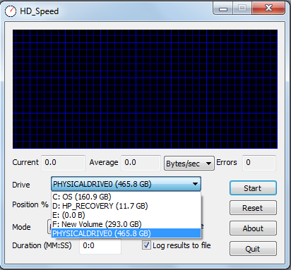 Once you launch the program it comes up with a small window where you have a graphical view at the top and a few options below it. The blue display is where all the transfer rates get depicted in a graphical format. In order to start the program you need to click on the start button and the program starts recording. However before you click on the start button there are a few things you might need to change whereby you need to select the Drive from which the transfer rate is to be recorded. This could be accessed from the drop down appearing beside the option named ‘’Drive’’. Other things which you would need to configure are the record rates which could be bytes/second or bits/second. Further you would be required to select the mode of the program which comes with three options on it which are: