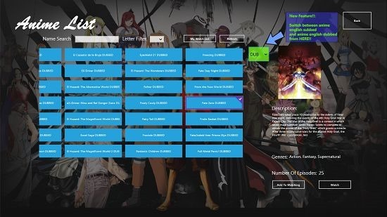 In the above screen, you can click on the DUB button (indicated by the arrow in the above screenshot) to reveal a dropdown menu from where you can choose to access either the dubs or the subs of animes. I like watching the dubs as they are in English, the subs mean that the anime is in some other language but is subtitled in English. When you click on an anime name, it will be ticked and its short description will be available on the right side of the screen. To start watching it, click on the Watch button at the bottom right of the screen.