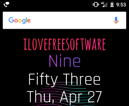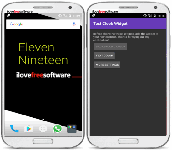 As the name suggests, Text Clock Live Wallpaper is a text clock app which displays time in words in form of a live wallpaper. It offers a new level of uniqueness in contrast to other text clock apps on my list. The best part is that the time gets updated in real-time and it doesn’t lag or affect the phone’s performance at all. So, if you don’t want a text clock widget, then you can settle with this live wallpaper to watch time in form of words on your home screen. In addition to text clock, it also displays the current date, day, and battery level of your phone. I liked it very much but I think the text font style should be changed. Apart from that, you will need to keep your home screen clean to view the time in words clearly as other widgets and app icons can affect the view.