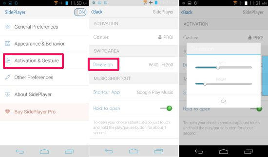 In the settings you get to manage the activation area of the app, tap on ‘activation & gesture’ option and you will have the options as seen below. Now tap on the dimension option as pointed below and then change the swipe area according to your choice. I have not covered other options in the SidePlayer, as most of them are paid.