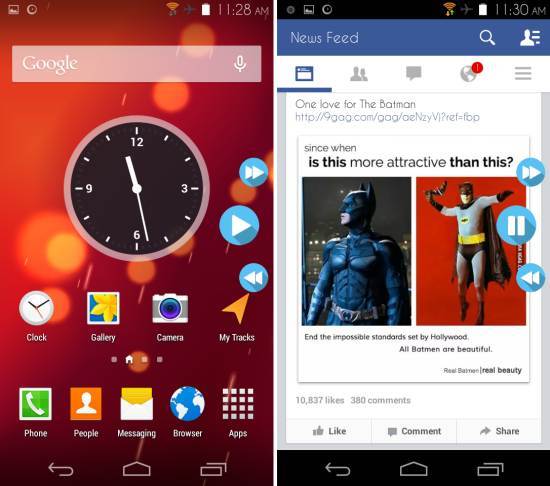 SidePlayer for Android is a free Android app for your device which lets you control your music with swipe in playback controls. The app provides you with controls to play, pause, skip forward, and back. These controls can be accessed anywhere in the OS with just a simple swipe from the left edge of the screen. You can bring up these controls whenever you want and hide them when you’re done. SidePlayer for Android works with any music player, which is very helpful. This app is available all the time and everywhere in the OS.