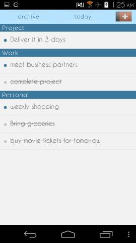 You can keep on adding tasks to Aizon.me to-do list for Android and built up a list which is divided by categories. To dismiss a task, simply tap on it and it will be strikethrough as seen here, this allows you to visually see which tasks you have completed. In a similar manner, you can add pending items to the archive section.