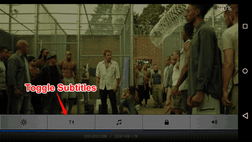 RockPlayer2 is another Video Player which can be used to play Subtitles along with your videos. RockPlayer2 is significant on this list because of its intuitive interface which seems to have been built from ground up for touchscreens. As for subtitles, Rockplayer2 does not seem to have the option to browse for Subtitles file (at least I could not find it). It will, however, detect the subtitle if it’s by the same name as the video file, and resides in the same folder. As can be seen in the screenshot above, you can choose to Switch the Subtitles OFF or ON by simply tapping on the “T1” button on the Video Playback screen.
