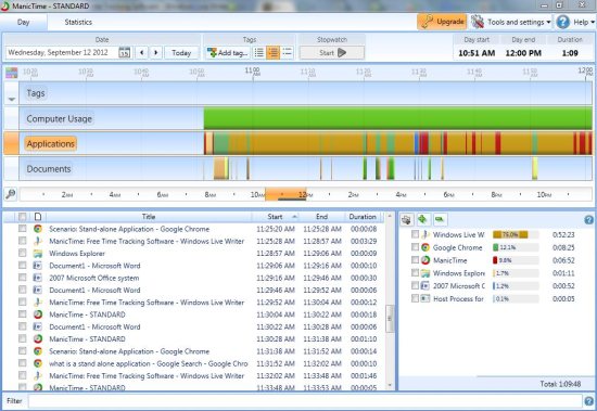 Fourth time tracking software on board this list is ManicTime. This is a software that comes with a very intuitive interface and runs from the system tray of your system, after being installed. The software sits quietly in the background and keeps tracking the amount of time you spent on an application. When you open some application, document or something, the software automatically starts recording the time for which its open. All this info is separated into different tabs and you can open the software anytime to view the time you spent. The software also helps in generating some interesting statistics.