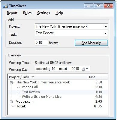 The final time tracking software in this list of TimeSheet. This is quite a helpful software with some very helpful features. The software allows you to add different activities and projects for which you would like to record time. After that, you can associate different application to those projects. Once it is done, every time you open that application the software will automatically start recording the time until its closed. This way you can record time for all your activities and view the total amount of time spent on different projects. These time sheets can also be exported.
