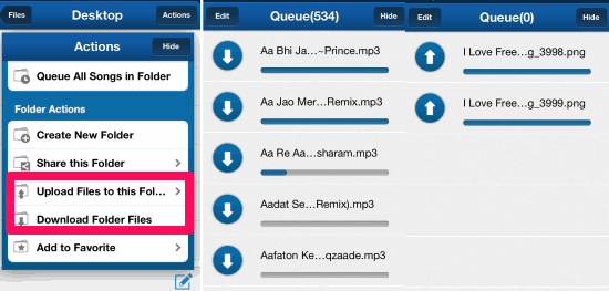 Now, launch the Tonido iPhone app and tap on + button at top right corner to enter the details of your account. You need to enter the URL, account name, and password to continue. After successful addition of your account, tap on your account’s name to access all the files stored on your PC directly from your iPhone. To transfer the songs, tap on the Files option on left sidebar of Tonido iPhone App. Here, you will find all the files, folders and drives of your PC. Now, go to the exact location of your songs, videos or images whichever you want to transfer. Navigation process is similar to the one which you use while navigating on the PC. When you have reached the exact location of the files, tap on icon at bottom right corner to select multiple files at once. After selecting the files, tap on Actions button at top right corner to reveal the options. Now, simply tap on the Download Folder Files option to transfer them to your iPhone.