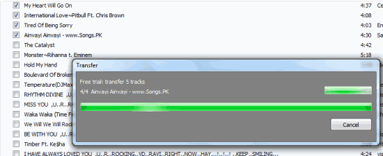 iPod PC Transfer is the tool which lets you transfer the songs from iPod to PC and it works even without iTunes installed on your system. The interface of the software is very simple with all the songs stored on your iPod being displayed directly on its home screen. To transfer the songs, simply select the songs you want to transfer and click on the Transfer option at top right. The only limitation is that it lets you transfer only up to 5 songs in one go if you are using the free version. You can use this tool to transfer any number of songs, but in groups of 5. For example, if you have 20 songs, then you can transfer them in 4 runs of 5 songs each.