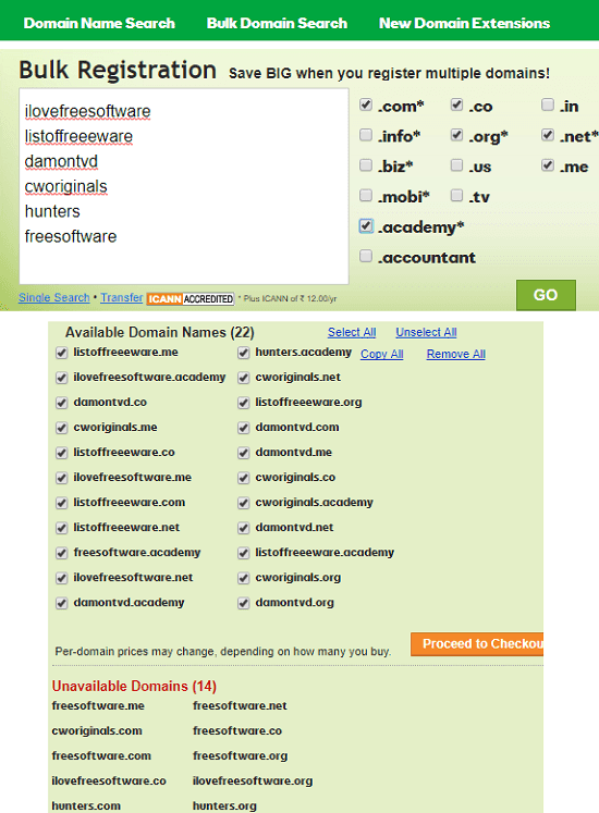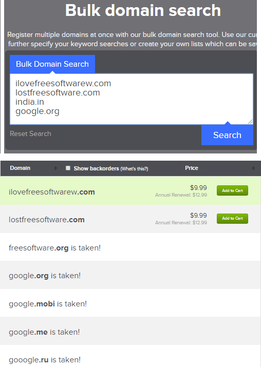 Here are 5 free bulk domain name availability checker websites. These websites will let you search for a list of domain names for their availability. You can specify a list of domains in these websites and they will tell which ones are available and which one are taken. Not only this, if a domain is available, then you will be able to see its price on these websites. Some of these websites can also show you the domain price from multiple domain seller websites like GoDaddy. Checking domain availability on these websites is very simple and you don’t even have to create an account to use the domain checker tool of these websites. And while specifying the domain, you can either specify TLD along with it or you can choose multiple TLDs from a list explicitly.