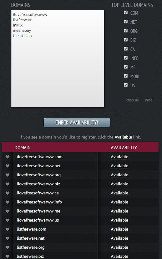 The domain availability checker on this website is free to use and you can access it using the URL above. After getting to the domain search tool, you can enter the set of domain names you want to check for availability. And you can do that in two ways. You can either specify the domain names along with the TLD and get the availability result. Or, you can just specify the domain and the select predefined TLDs from a list and the tool will make a combination of domain names and eventually show you the availability result. You can then do whatever you want.