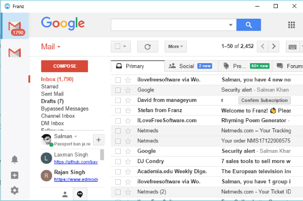 Franz is another free Gmail desktop client which can be used to easily read, receive, and send emails from Windows PC. You can open up this software and then add your Gmail account with ease. This one also opens up an identical interface to that of the actual Gmail inbox. Similar to Rambox, you can add and use multiple Gmail accounts in the same window but on separate tabs. It also has some additional options like enable/disable notifications, auto-spell checker, etc. This software is completely free to use for unlimited Gmail accounts, but you can enjoy some additional feature on the paid version such as premium support, team management, etc.