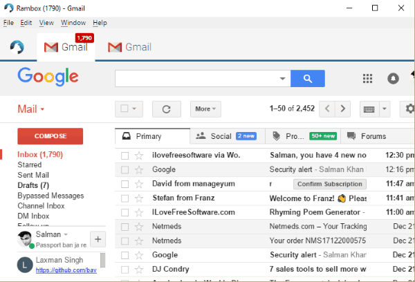 Rambox is probably the best free Gmail desktop client for Windows. It allows you to easily connect your Gmail account to receive, read, and send emails. After connecting the account, you will see the exact interface of Gmail inbox on your PC. One of the best features of this Gmail desktop client is that it allows you to connect and use multiple Gmail accounts in one window (with separate tabs) at the same time. It also offers some other useful features like “Don’t Disturb” to mute all the notifications and sound, “Lock” to lock Rambox temporarily, etc.
