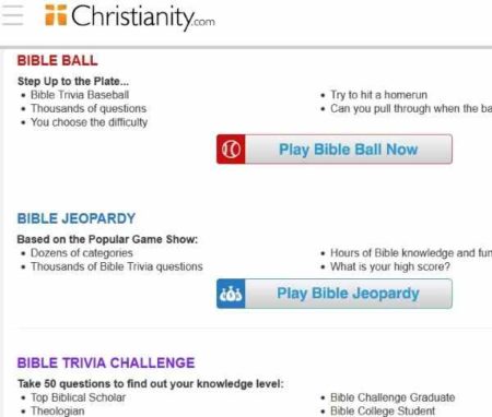 Christianity is a great website to find Bible quizzes. There are some very unique quizzes which can be seen listed on the screenshot above. These quizzes have a very engaging play method, which will want you to play more. The first quiz Bible Ball is like playing Baseball against the computer. You will be asked questions with multiple choices. You have to choose how many runs you want to score with that question while you are batting. Then when you are pitching you are suppose to answer the question right to strike out the computer. I found this quiz play very interesting.