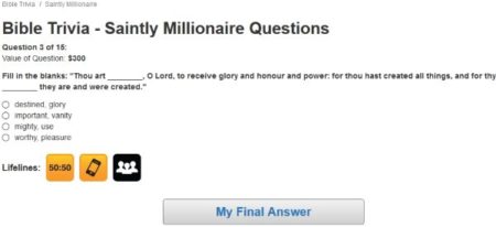 Similarly, in Bible Jeopardy, you will see categories and button with a dollar amount on it. You have to choose your category and the dollar amount you want to play for. If you answer the question right, the dollar amount is added as your score. Another fun quiz is Saintly Millionaire. This quiz is based on the pattern of the famous quiz game “Who Wants to be a Millionaire”. You will be asked question and you will have to choose from the four given options. You also get 3 lifelines as seen in the TV game show. A screenshot of this quiz can be seen in the screenshot below.