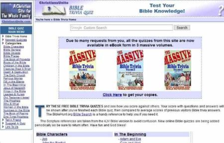 ChristiansUnite is a website with lots of quizzes around the Bible. They have even compiled eBooks in 3 volumes containing all the quizzes that are on the website. There are lots of quizzes in various categories like Bible characters, in the beginning, Bible general, Bible objects, Bible places, books of the Bible, children in the Bible, the book of Proverbs, the prophets, the early church, famous stories, fill in the blanks, etc. You can choose any quiz that you like.