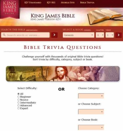 King James Bible Online has a entire Bible trivia section to play lots of quizzes. The quizzes home page can be seen in the screenshot above. On this page you can select the level of difficulty to test your knowledge. You can choose among beginner, novice, intermediate, advanced, and expert. You can also choose a category of the quiz you want to play. There are 3 broad categories, subject, book, or category. You can choose anyone of these and then from the drop down window select your choice of topic. Then click the start the quiz button. This will take you to the quiz page.