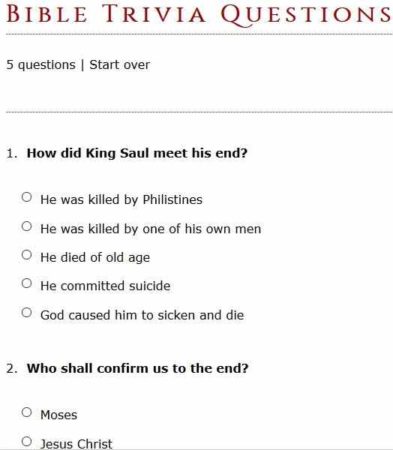 These are the 5 free online Bible quizzes websites. You can check out your Bible knowledge by taking quizzes on any of the websites. In my opinion the most interesting quizzes can be found on the Christianity website. I definitely enjoyed playing those quizzes. You can try out all the websites and see which one you like the best.