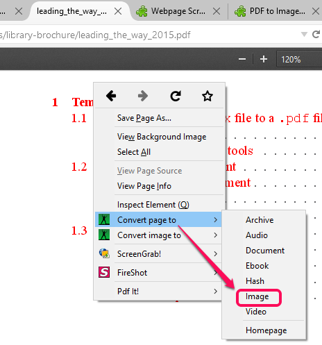 This plugin takes the help of one of the popular file converting websites, “online-convert.com”, to turn an online PDF into images. It provides right-click context menu option to convert a webpage or PDF file to JPG, BMP, TIFF, TGA, WebP, or GIF images. For a multipage PDF, it creates separate images.