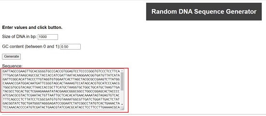 Simply specify the size (length) of the DNA and the value of nitrogenous bases in a DNA or RNA molecule that are either guanine (G) or cytosine (C). Next click on the ‘Generate’ button and the random sequence DNA will be displayed on the screen.