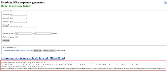 Simply input the fraction of A, G, C and T (calculated automatically, Specify the length and number of sequences that you require and click on the ‘Generate’ button. You will notice the random DNA sequence will be immediately displayed on the screen.