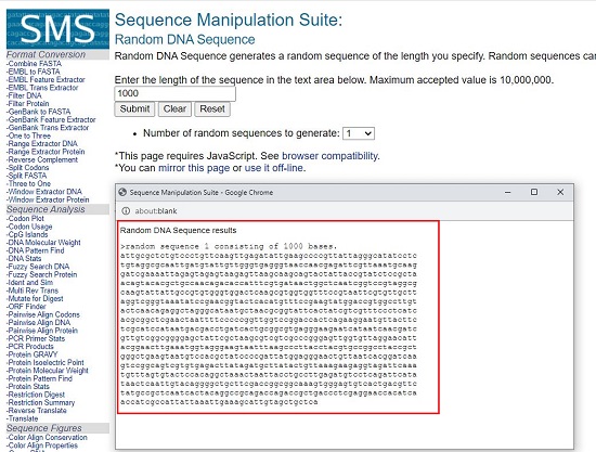 All that you need to do is input the length of the sequence in the text area (Maximum accepted value is 10,000,000), choose the number of random sequences to generate using the corresponding drop=-down and then click on ‘Submit’ You will observe that a small window pops up with the required DNA sequence of the specified length.