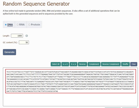Specify the length of the sequence and the percentage of GC content, and then click on the ‘Generate. Button. The random sequence will immediately be displayed on the screen with the specified length. You can use the corresponding buttons to create a Reverse, Complement or Reverse Complement. Alternatively, you can keep clicking on the ‘Shuffle’ button to generate more random DNA sequences.
