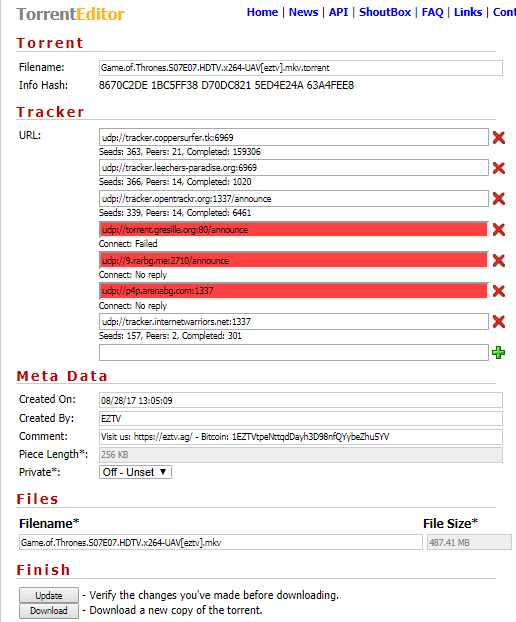 Using this website to edit torrent file is very simple. Just go to its homepage and then upload the target torrent file. After that, it will show you the information of torrent like metadata, filename, URL of the trackers, and some other information. You can edit this information easily and while editing, you will see the status of the trackers on its interface. So, you can remove the bad trackers and download the modified torrent file on your PC.