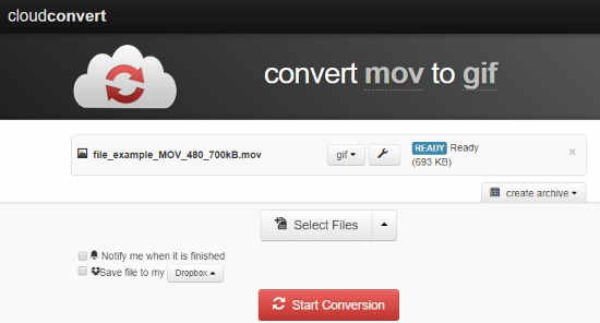 CloudConvert is an online MOV to GIF converter. When you open the website link, it shows an interface. You can upload the MOV file from your computer. Besides that, you can choose input files from Dropbox, Google Drive, Box, One Drive, URL.