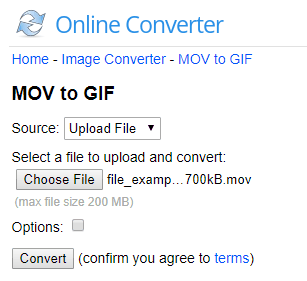 Online Converter is an online MOV to GIF converter. After opening the link, you will see an interface. Firstly, you have to select a source if you want to upload the input file from your computer or from URL. If you choose URL then enter the MOV file URL or browse the file from your computer.