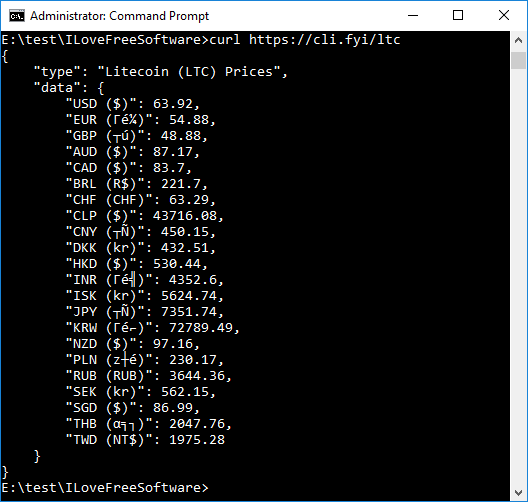 Cli.fyi is one of the best free command line tools to see cryptocurrency exchange rate. It works actually like an API to retrieve the cryptocurrency prices from its server. And you can use it from command prompt with the help of Curl. It can fetch you prices of various cryptocurrencies including BTC, ETH, TIT, STC, LTC, XDN, XMR, and many more. And the best part about it is that it can show you the price of a queried cryptocurrency in many currencies like USD, EUR, INR, ISK, JPY, PLN, HKD, and many others. You can see that in the screenshot below. When you query a cryptocurrency price, it returns a JSON response.