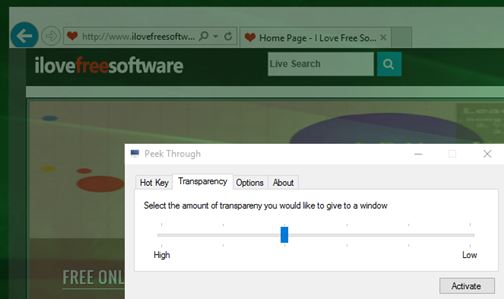 Peek Through adds a system tray icon for accessing the control panel. This windows opacity software lets you configure up to 6 levels of opacity which are set using the control panel.