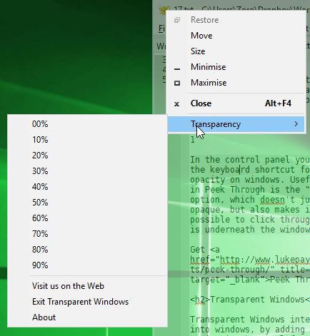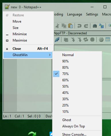 From the GhostWin option which is put there by the application, using the drop down, you can change the opacity of the program window 10% points at a time. If you want to go back to a fully opaque window, just make sure to click on the “Normal” option.