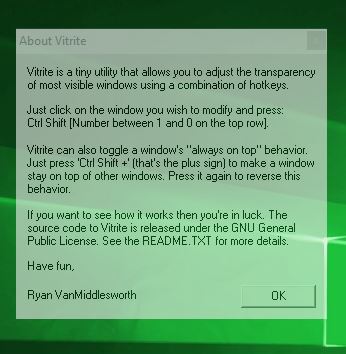 Vitrite is yet another window opacity software for Windows 10 with a unique method of controlling the opacity. Here you control the window transparency using a combination of Ctrl + Shift + 1-0 keys on the keyboard. Each keyboard key between 1-9 sets a different level of opacity and 0 turn the opacity off, meaning the window goes back to normal.