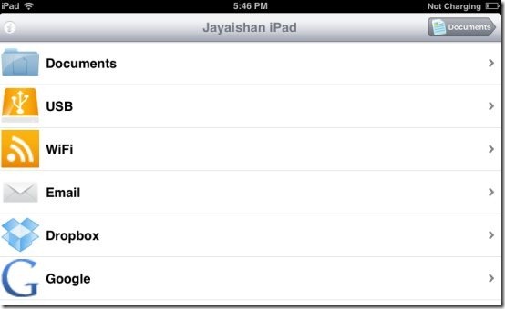 Launch the app and then tap on plus (+) button at the right bottom in the app. Now select the document type and create a new document. If you want to import any document file from web, then tap on “iPad” button at the upper left in the app. Select the service which includes Google docs, Dropbox, Email, Wi-Fi, and USB and proceed further accordingly.