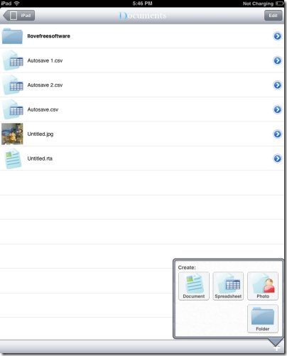 The app allows you to import document files (spreadsheet and text file) by syncing your Email, Google docs, Dropbox, through Wi-Fi syncing and via USB from iTunes. The app even lets you create a new document on iPad.