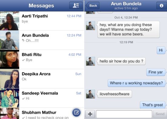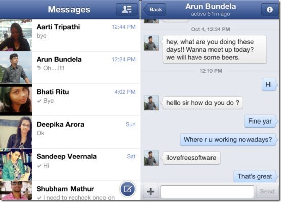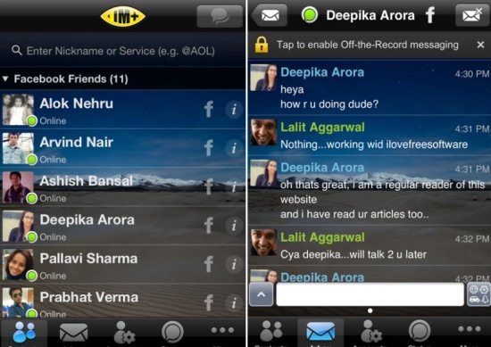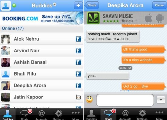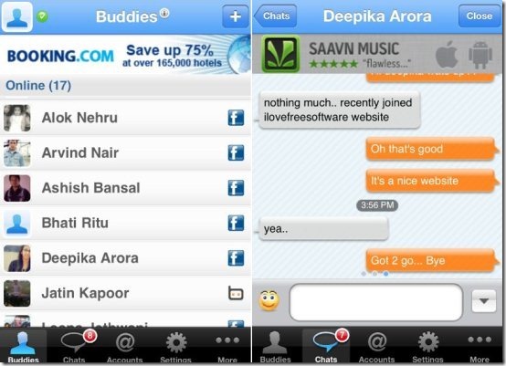IM+ Instant Messenger is another popular app that lets you chat with your Facebook buddies on iPhone. Instant Messenger is also available for both iPhone and Android. Apart from Facebook, the chatting client app also lets you connect to Google Talk, AOL, Windows Live Messenger, Neighbors, and Yahoo Messenger. As soon as you login to your Facebook account, the app automatically imports all your Facebook contacts and separates all your online Facebook friends. Just tap on the any friend’s name and start chatting. Apart from all these, you can easily add multiple Facebook accounts and manage them with ease on your iPhone. Also, check out the full review by us on IM+ Instant Messaging app for Android.