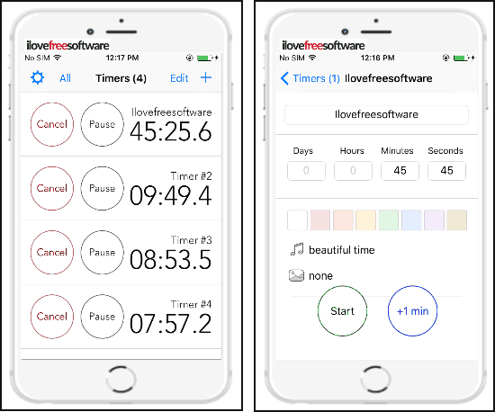 Timers is the last multiple timer iPhone app on my list to set multiple timers on iPhone. It is a pretty simple app and doesn’t provide other advance features like start, pause, reset all timers at once, auto repeat timers, etc. It also doesn’t give you the option to set different alert sounds for timers. It just simply plays a beep after the duration of a timer runs out. To add a timer, tap on the “+” button and then specify the duration of the timer. You can set a timer up to 23 hours 59 minutes 59 seconds. After that, tap on the Start button to start the timer immediately. You can then see the timer on its main interface. As I mentioned, it plays a beep sound after the timer goes off. I really liked the simplicity of this app and will recommend you to check it out if you love simple apps.