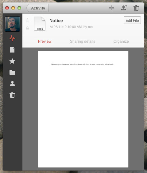 - You have a sidebar which is dark that has icons and a profile picture. Each of these buttons corresponds to a specific function. Namely from bottom to top: trash, contacts, folders, favorites, files, and activity.
