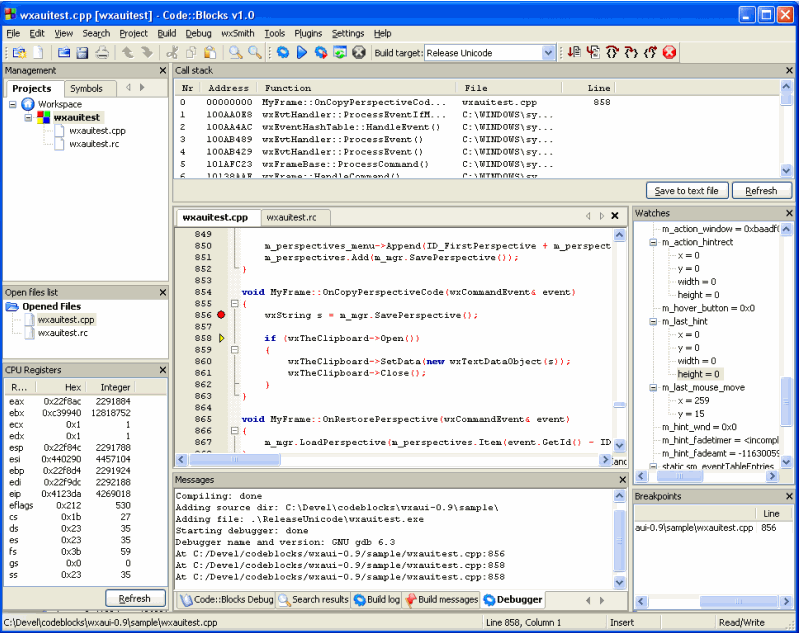 Code Blocks makes it very easy to debug your C++ code. You can put breakpoints through out the code, and define custom watches. You can even put conditions on breakpoints, so that execution is paused only if a condition is true. Some of the other Debugging Features: