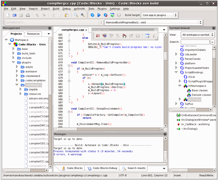 Code Blocks is made in such a way that the functionality can easily be extended by plugins. Even some of the core functionalities of Code Blocks is provided through plugins. Many core plugins are installed by default (like Debugger, Compiler). There are many 3rd party plugins also available that can further improve the coding experience. I browsed through the plugins list, and found some pretty interesting ones: