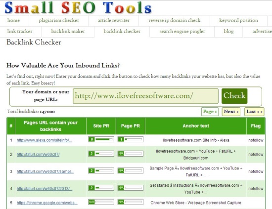 Backlink Checker from Small SEO Tools, is a free, web-based backlink checker tool. It lets you quickly find out the total number of backlinks pointing to your site, plus the page URLs that contains those backlinks. With each (backlink) URL, you get additional information, including Site PageRank, Page PageRank, Anchor Text, and DoFollow/NoFollow info. This might be helpful in knowing the quality of the backlinks that your site has.