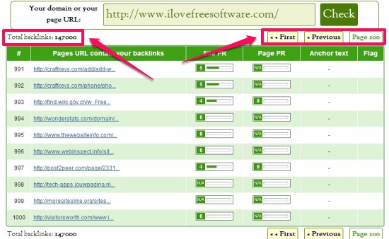 As I mentioned in the beginning, Backlink Checker gives you the Page URL that contains incoming link to your site, its Site PageRank, Page PageRank, Anchor Text, and DoFollow/NoFollow information. The tool displays the whole information in a nice tabular format, with 10 entries per page, for the top 1000 backlinks your site has. The Total number of Backlinks are shown at the top and bottom left of the table, and navigation buttons are present on the right side.