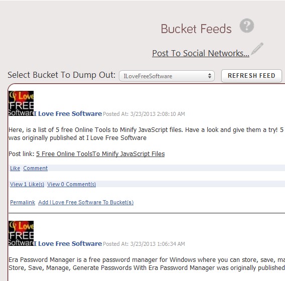 On the image below you can see that we have setup ILoveFreeSoftware Facebook group update feed, and now instead of having to open up Facebook to check for updates, we simply opened up the Bucket where we placed our Facebook feed, and clicked on the Refresh Feed button. Interface of mybucketz is very simple, not clunky at all, with just one menu in the top right corner of the screen. You can also post to social networks that you’ve setup directly from mybucketz.