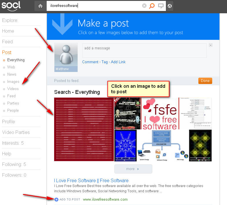 You create your post when you receive results, and then you start adding images, links whatever it is that the search results have found to create your very own post. For starters, we added a picture, a link and wrote a message from us, something similar to a tweet which will be shown next to our post. After clicking on the Done button, the post is created and it can be seen by your friends who are following you and reading your Feeds.