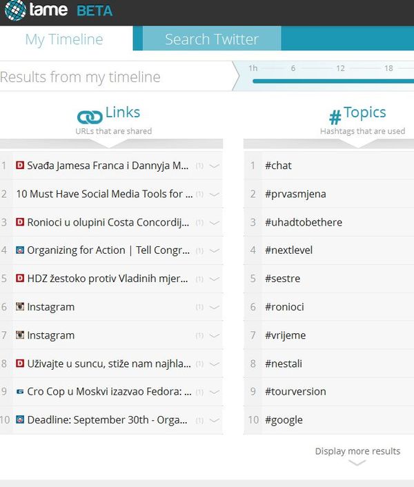 Tame.it is a free web based Twitter analyzer which you can use in order to easily organize and go over links, topics and people mentioned in tweets on Twitter, from your own timeline and also the main Twitter feed. To do that, you’re gonna have to register an account on Tame.it and then allow it access to your account. As soon as you do that, you’re gonna be presented with a list of links, tweets and people that are very popular and regularly mentioned in your tweets.